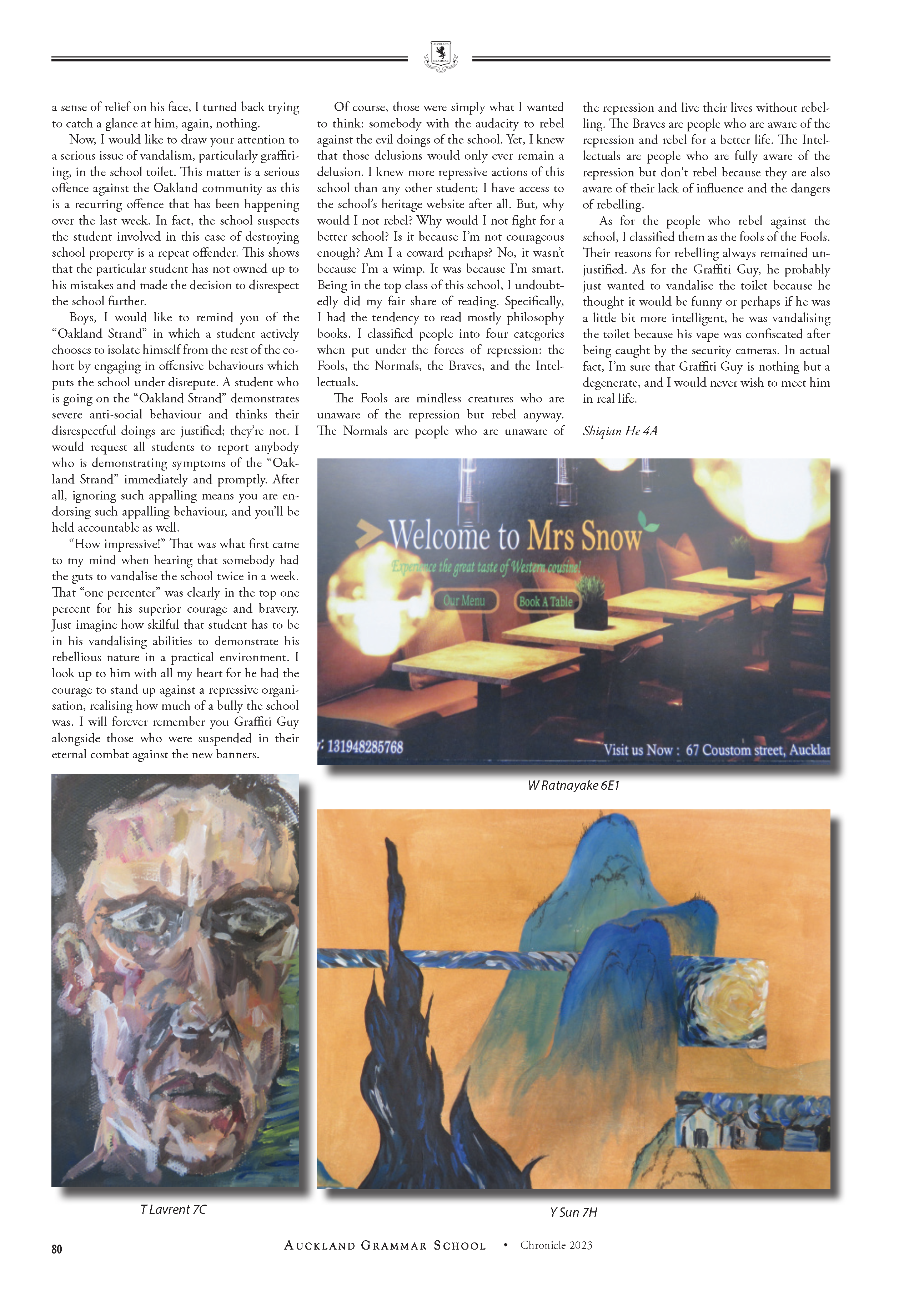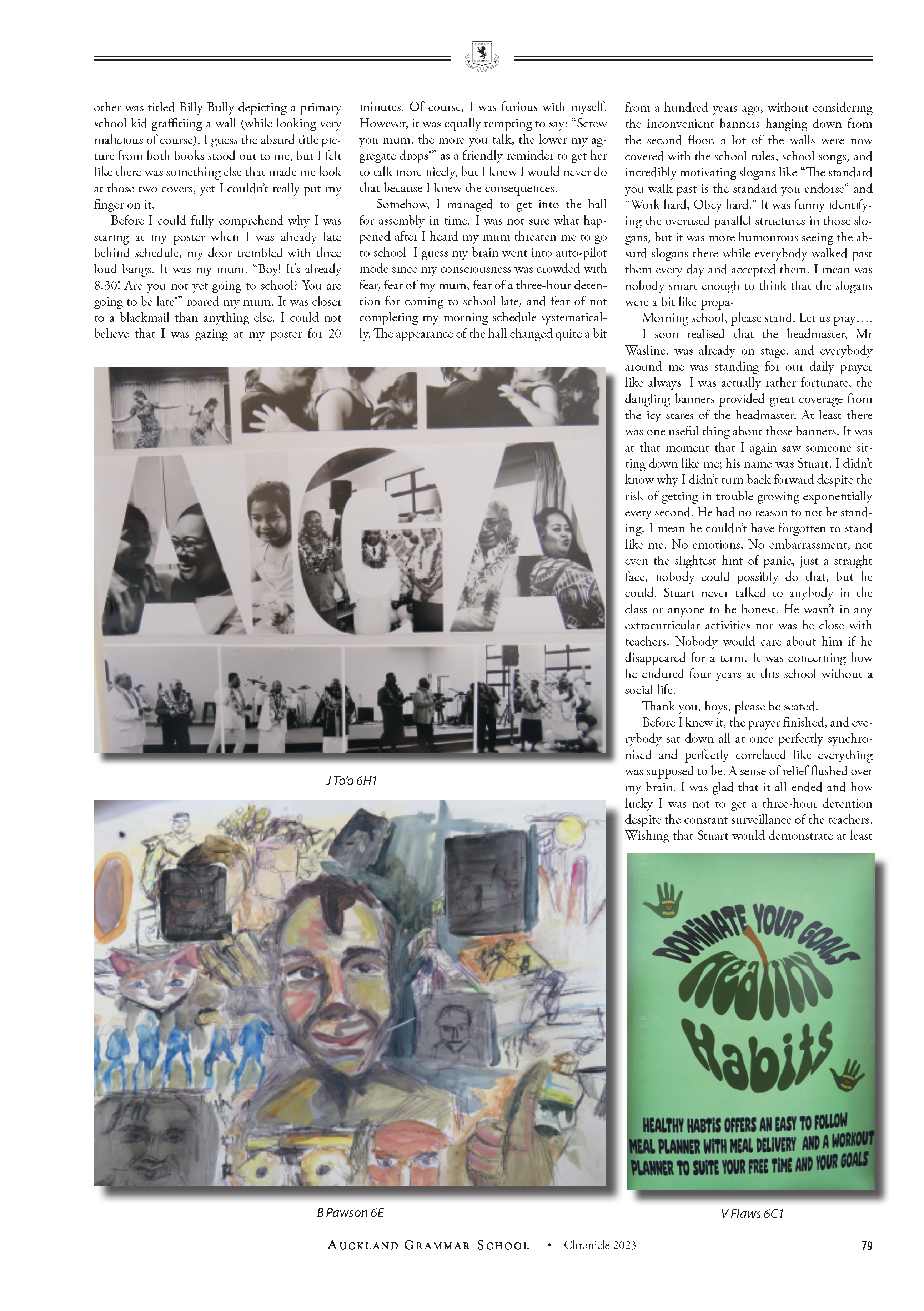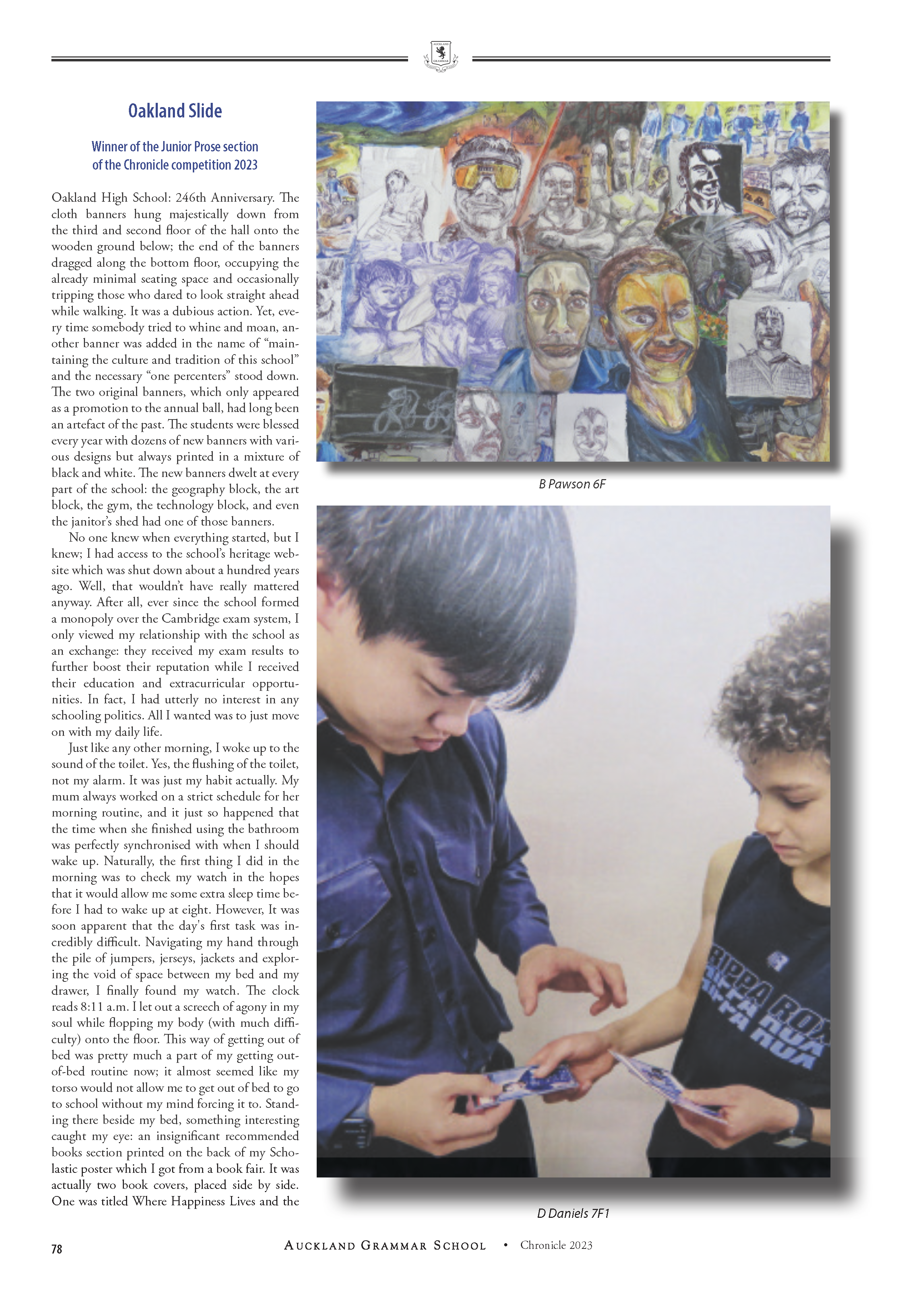 这是谦发表在他们学校2023 Chronicle上的文章. 貌似是一片架空现实的小说, 说实话我读得不是很懂, 看看大家是否能读懂了. 他们学校的校报是每年一次的, 所有人都有一本, 所以他的文章被学校所有的同学和家长都看到了. 学校还给他奖了一百刀.