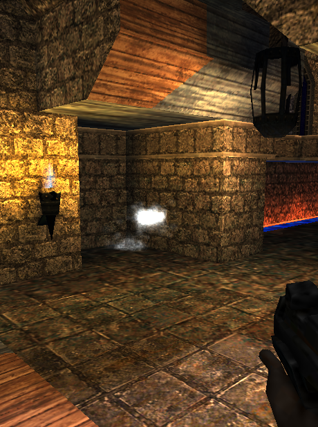 第二,在Windows CE上porting了一个3D game engine,也算是CE(或者应该叫EC了)上的第一个成规模的game engine了,但愿能对别人有点用。贴张效果图吧。用的是quake 3的map。展示了光源,particle系统等。