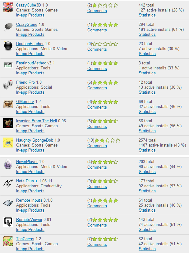 推荐本人课上进入Android Market的作品 本学期《移动应用开发》课程接近尾声,正如课程考核要求,课程项目必须全球发布,接受全球Android用户的考验。至今,十几个课程项目已经基本进入Market。推荐大家猛烈下载。 所有作品大集合如下图,都为免费应用。 有几个程序居然被国内无良论坛的黑商店盗链。破解后把apk放在自己的论坛上供别人下载,Market里面的下载量不准了。 免费应用啊,何苦呢,何必呢?
