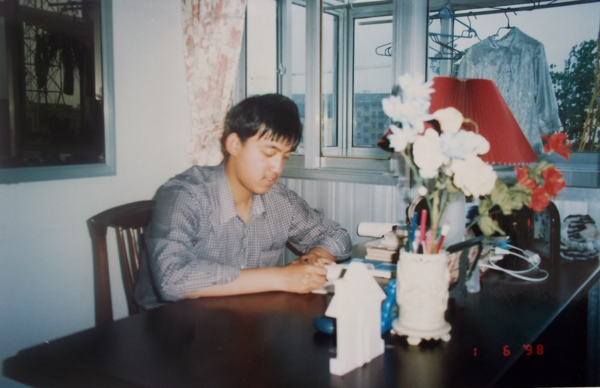 高中选了理科,当时分在了8班。跟初中三年相比,高中三年是非常枯燥、无味的三年。除了学习就是学习。三年,1000多天时间,其实用一天就可以归纳总结,我记得高中的时候写过一篇流水账,记录从5:11分起床到11:00睡觉的全过程。没有什么特别值得回忆的事情。每天晚上放学都跟许彬彬、张大明、刘树一一起回家。还记得送刘树一去当兵,那是我唯一一次晚自习逃课,也是第一次喝酒。这图是98年拍的,高二。每天晚上放学我还要在这张桌子上再学一个小时。